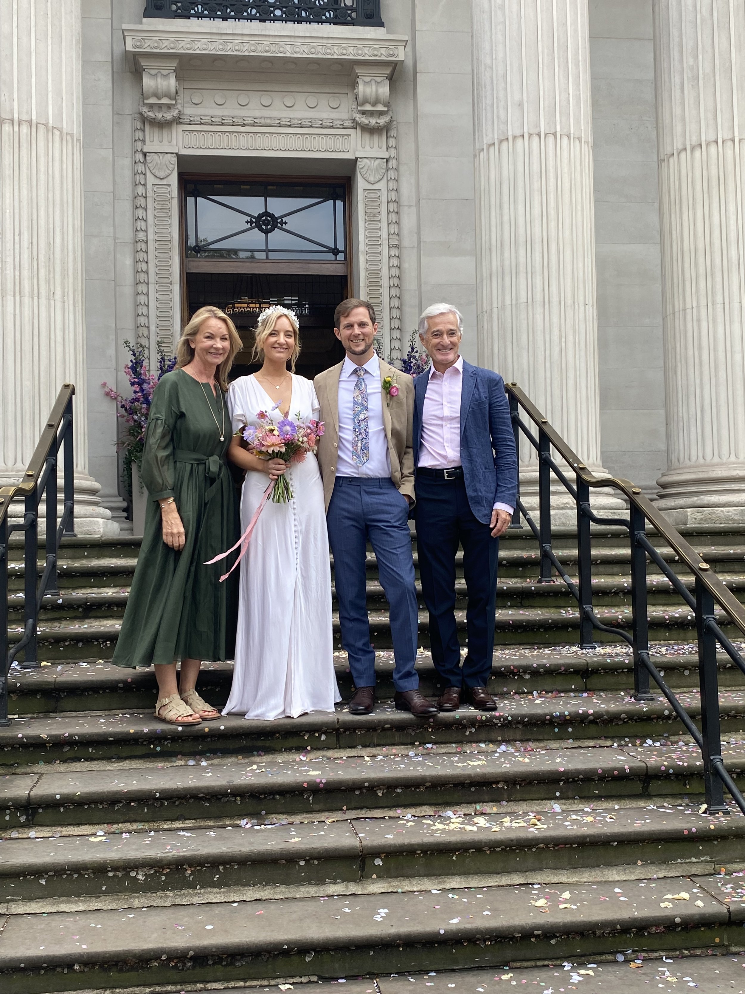 The ceremony was relaxed and fun; the groom managed to say “my awfully wedded wife” instead of “my lawfully wedded wife”, whereupon our daughter nearly fell over and everyone got the giggles. Afterwards, we threw confetti, took photographs, and cat-walked through the streets of London in our finery to the delight of quite a few Chinese tourists who snapped photos of us, clearly awed by such incomparable beauty and elegance!
