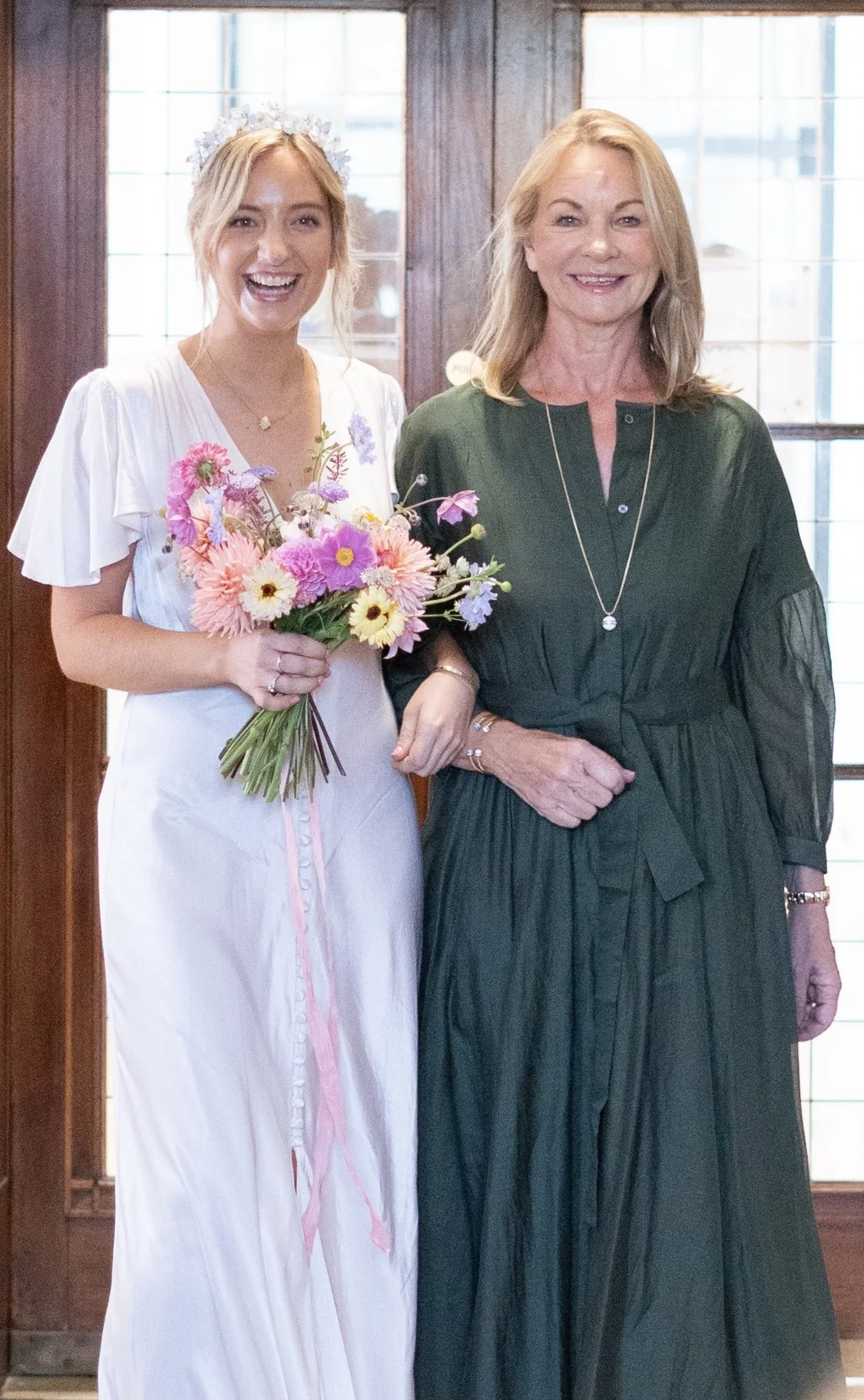 Naturally, our suitcase trauma immediately vanished into the recesses of our minds when our beautiful daughter appeared, the picture of romantic, simple elegance in a full-length, off-white, body skimming silk dress cut in a deep V in the front, featuring lots of tiny little buttons and short, floppy sleeves. Her thick, long blonde hair was styled in that perfect, casual yet intricate updo that only an excellent hairdresser can achieve and finished off with a beautiful tiara-like headband. Her bouquet was English countryside summer garden perfection.